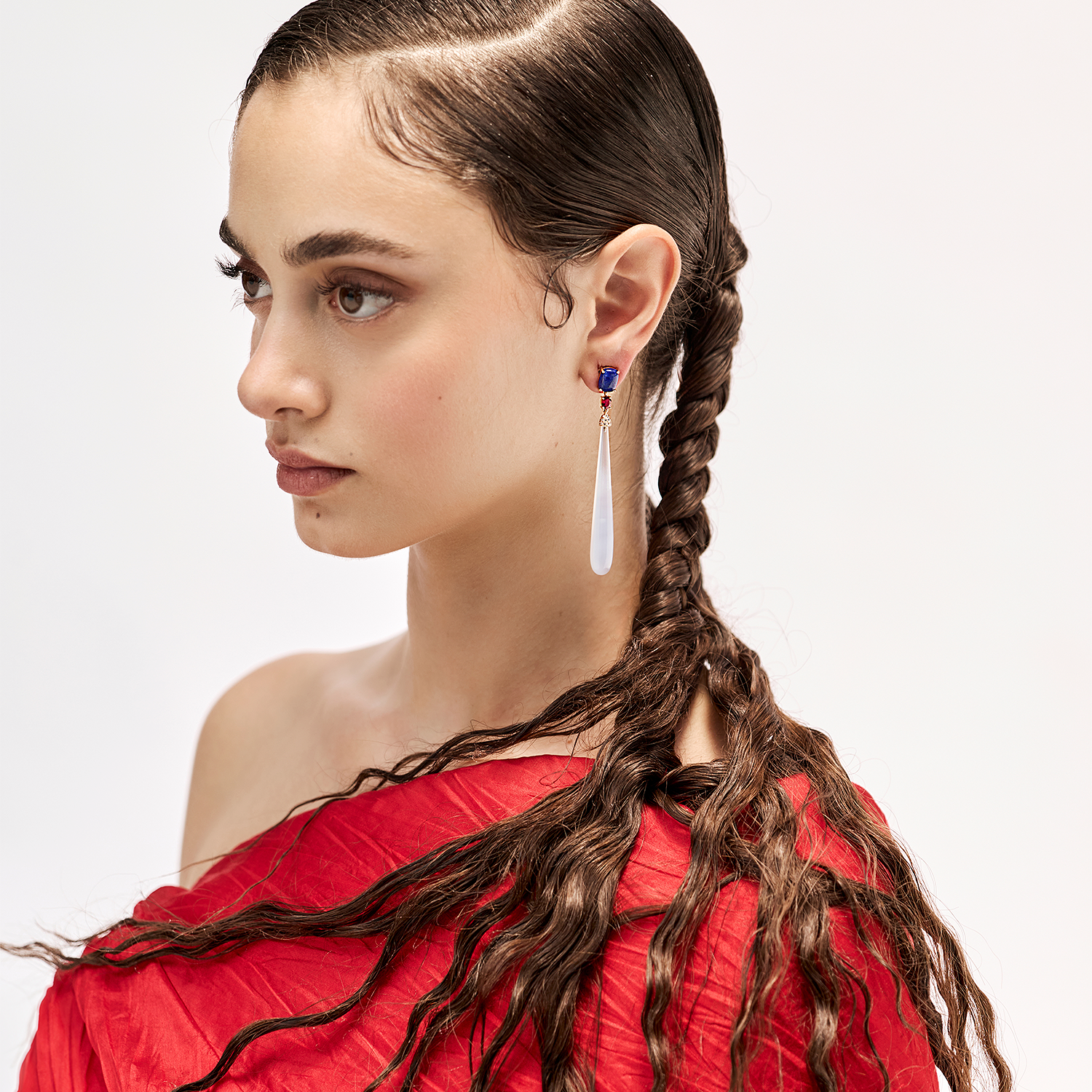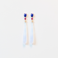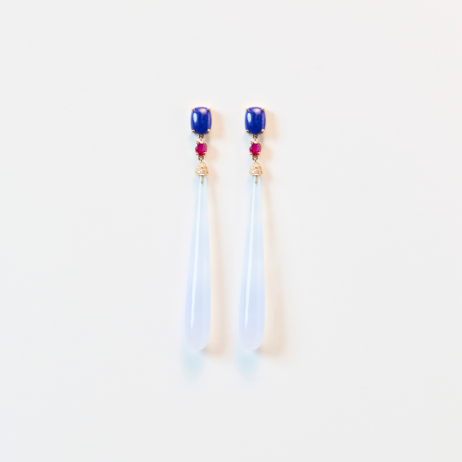 An extra-long Chalcedony drop is the star of this earring, delicate and powerful in equal measure. A touch of Lapis Lazuli lifts the pastel of the Chalcedony, while rubies and diamonds elevate the earring with sparkle.